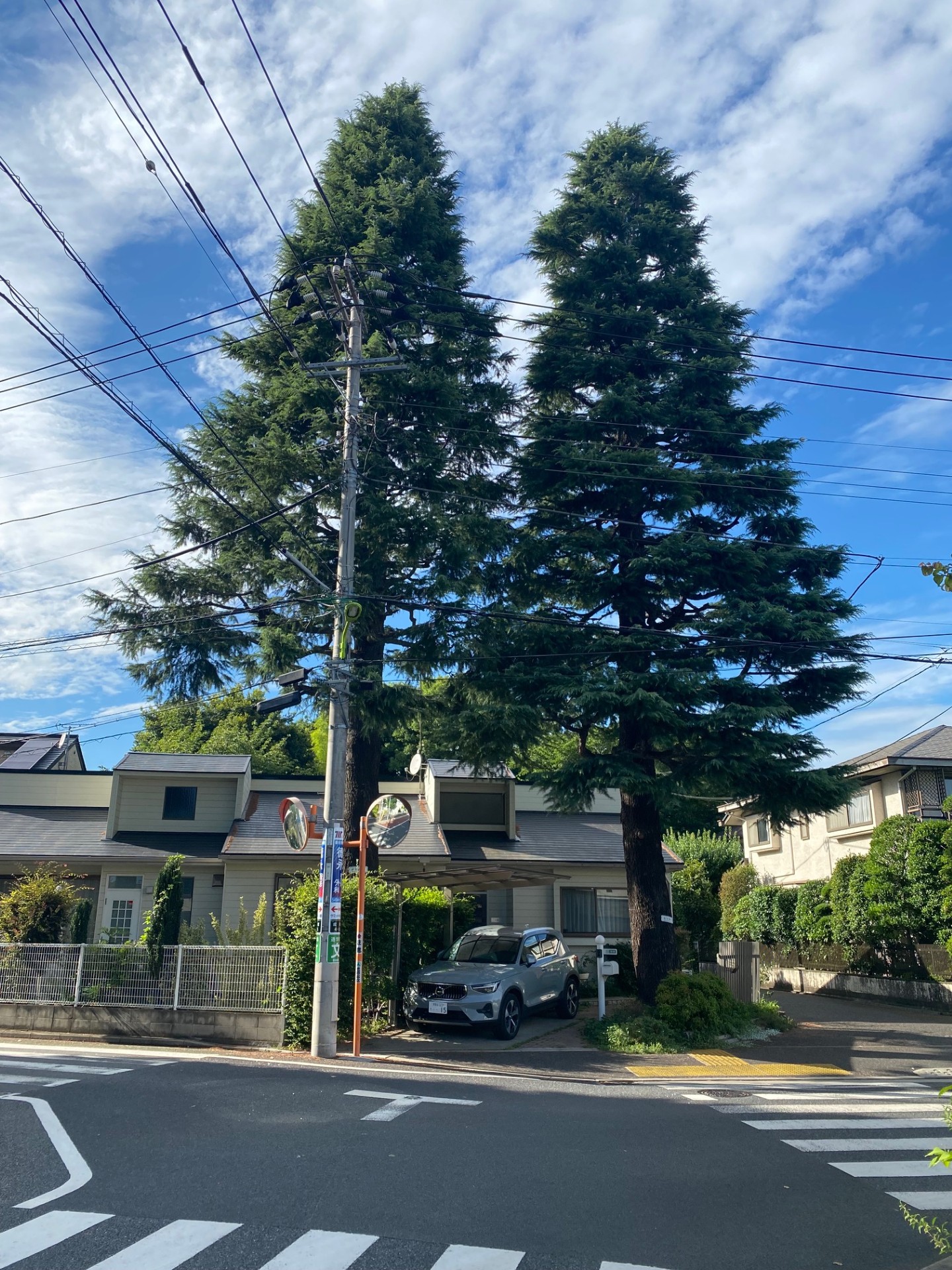 この住宅に残る2本のヒマラヤスギは、開発当初の面影を今に伝えている。当時、洋館にはヒマラヤスギ、和風建築の家には松の植栽が奨励された歴史があり、その名残として成城では今もヒマラヤスギがよく見られる。しかし、美しい景観が電柱や電線によって台無しになっているのは残念である。地中化が進むよう願ってやまない。