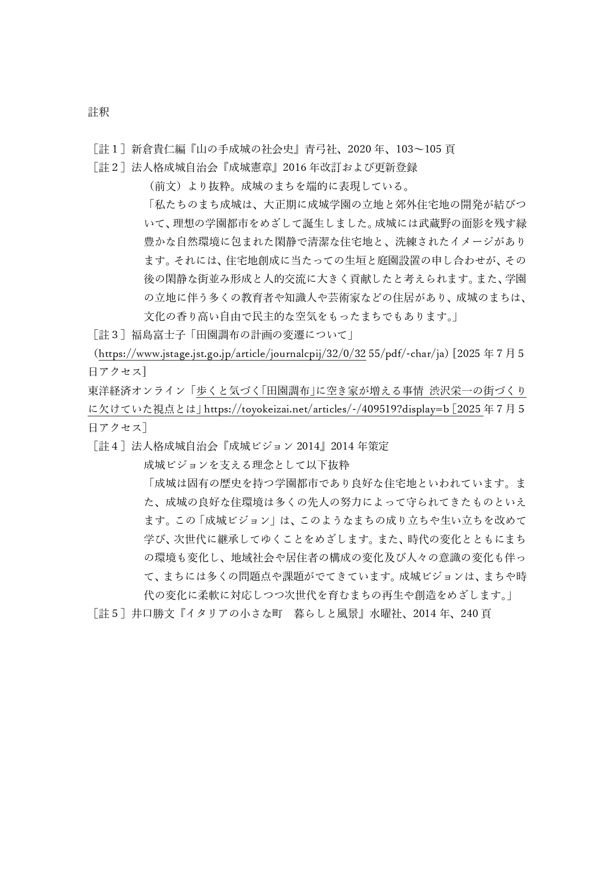 本稿では成城の魅力を歴史的、社会的な側面から考察し、その持続可能性と未来への展望について論じた。日本にはヨーロッパの主要国のように景観を守る強力な法律が存在しない。欧州景観条約が景観への「配慮を義務付けている」のに対し、日本の景観法は「考慮を促す」に留まる。[註5]このような制約がある中でも、成城は住民の自治を基盤とし、文化資産の保存・発信だけではなく、新たな価値の発見や、現代の生活に合わせた活用法の模索を通じて、緑豊かで文化的な魅力ある街として、将来にわたって維持・発展していくことができるであろう。