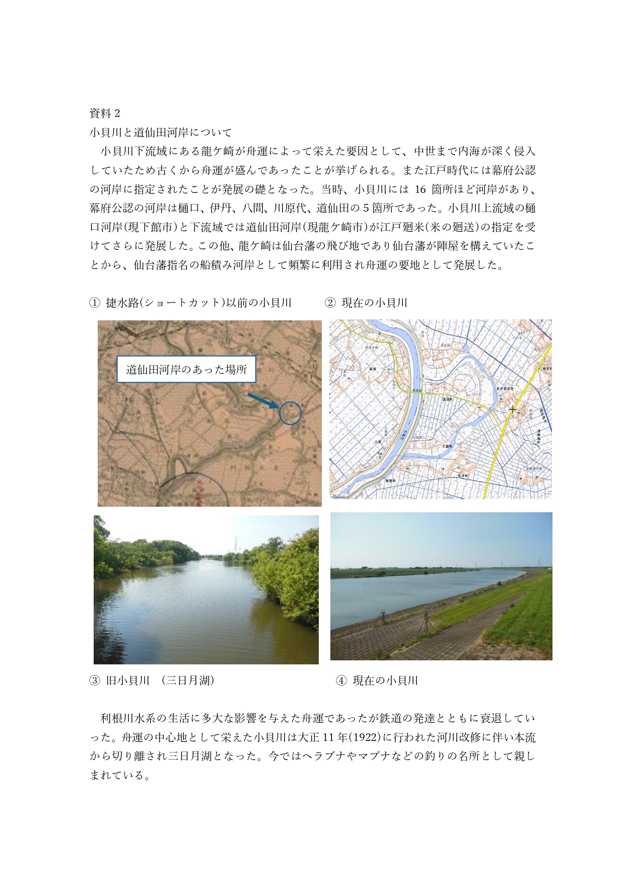 龍ケ崎市を流れる小貝川は利根川の支流である。江戸時代の利根川水系では、地方と大消費地である江戸とを結ぶ高瀬舟を中心とする舟運が発達した。舟運の発達は物資だけでなく民俗文化の伝播に大きな役割を果たした(資料2)。龍ケ崎の「撞舞」は利根川筋の藤蔵河岸(5)で船頭が帆柱に登って曲芸をしたことが始まりである。