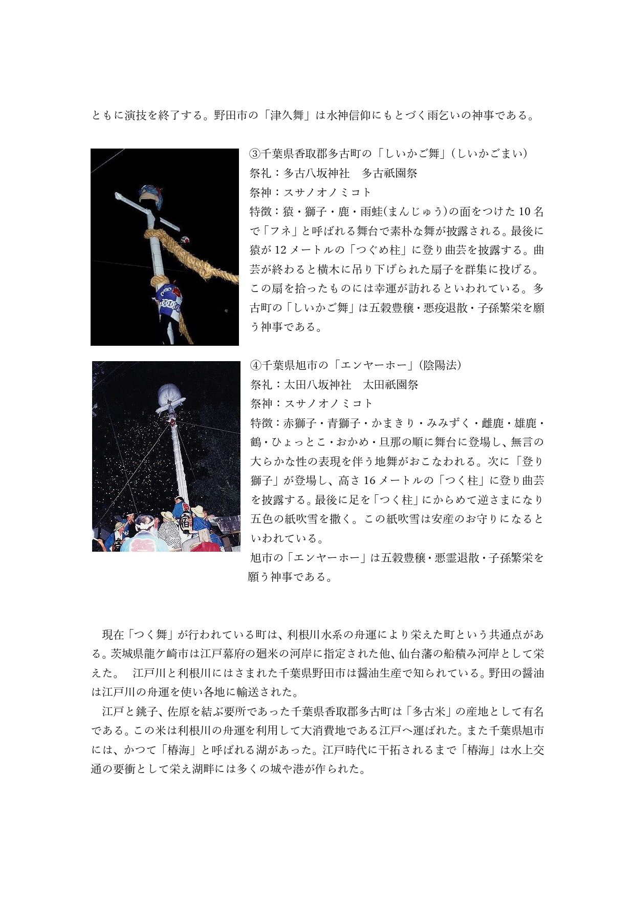 これに対し、多古町の「しいかご舞」と旭市の「エンヤーホー」(陰陽法)は登場人物が多く、「つく柱」の下にある舞台で行われる地舞が主体である。「つく柱」に登る動物は、多古町は猿であり旭市が獅子である。多古町の猿は水神としての一面があり(13)、旭市の獅子は雨乞い獅子(14)である点など「つく舞」は水辺に暮らす人々の御霊信仰(15)・祇園信仰(16)と、舟運により伝えられた文化が融合し神事芸能として継承されたと考察する(資料5)。