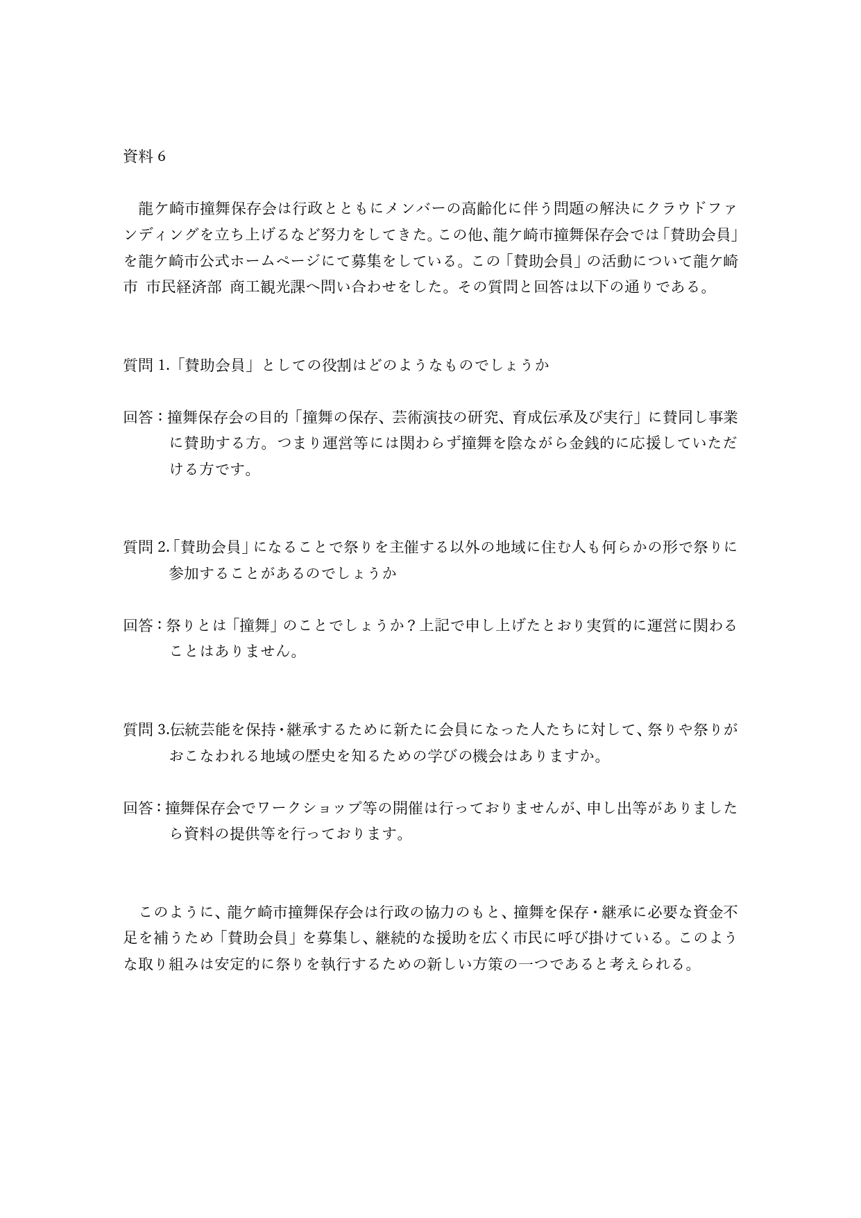 また「撞舞」の柱や櫓の設置は、龍ケ崎市撞舞保存会と龍ケ崎鳶職組合が担当し、観覧席や物産品の販売所の設置を事務局が担当している。このように、行政と保存会の協力体制のもと、今後も「撞舞」の伝統と文化は継承されていくと考えられる(資料6)。