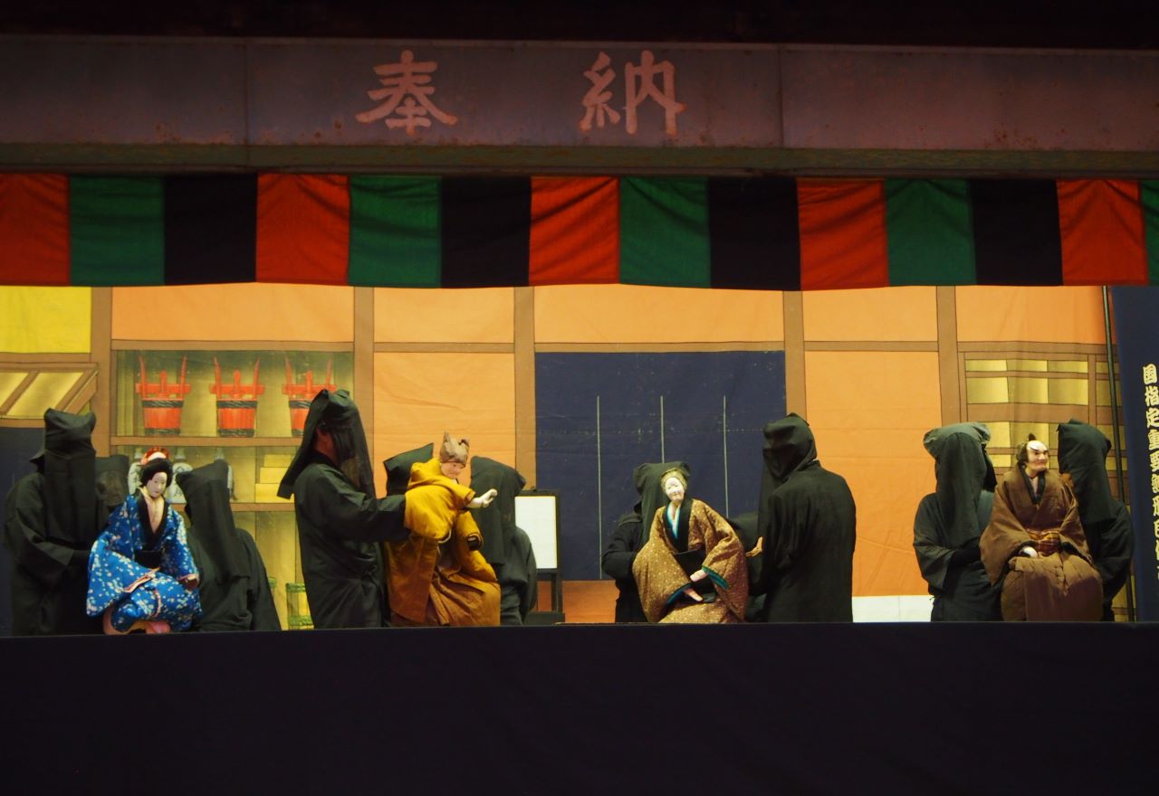 註1:人形一体に対し、頭・胴体・右手を扱う主遣い、左手を扱う左遣い、足を扱う足遣いの3役がある。