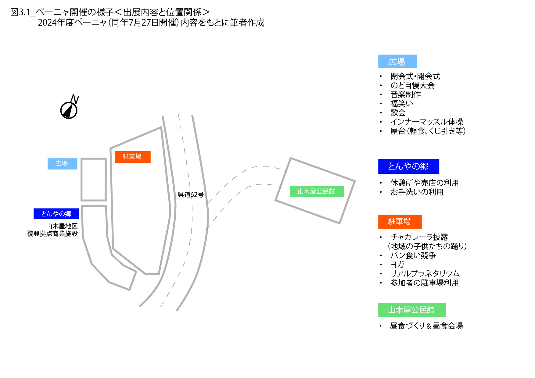「世代を超えて、飲食を通じ自由に交流できる非日常的な場」へのニーズが顕在化し、これを形にしたのが、2015年に初開催となった交流イベント「ペーニャ」である。初回のペーニャでは、大風呂敷の上を裸足で歩きながら飲食や歓談を行うという内容となった。原発事故以降、屋外で過ごす機会が制限されていた参加者たちは、草原を歩くように空間を楽しんだとされる(図2)。