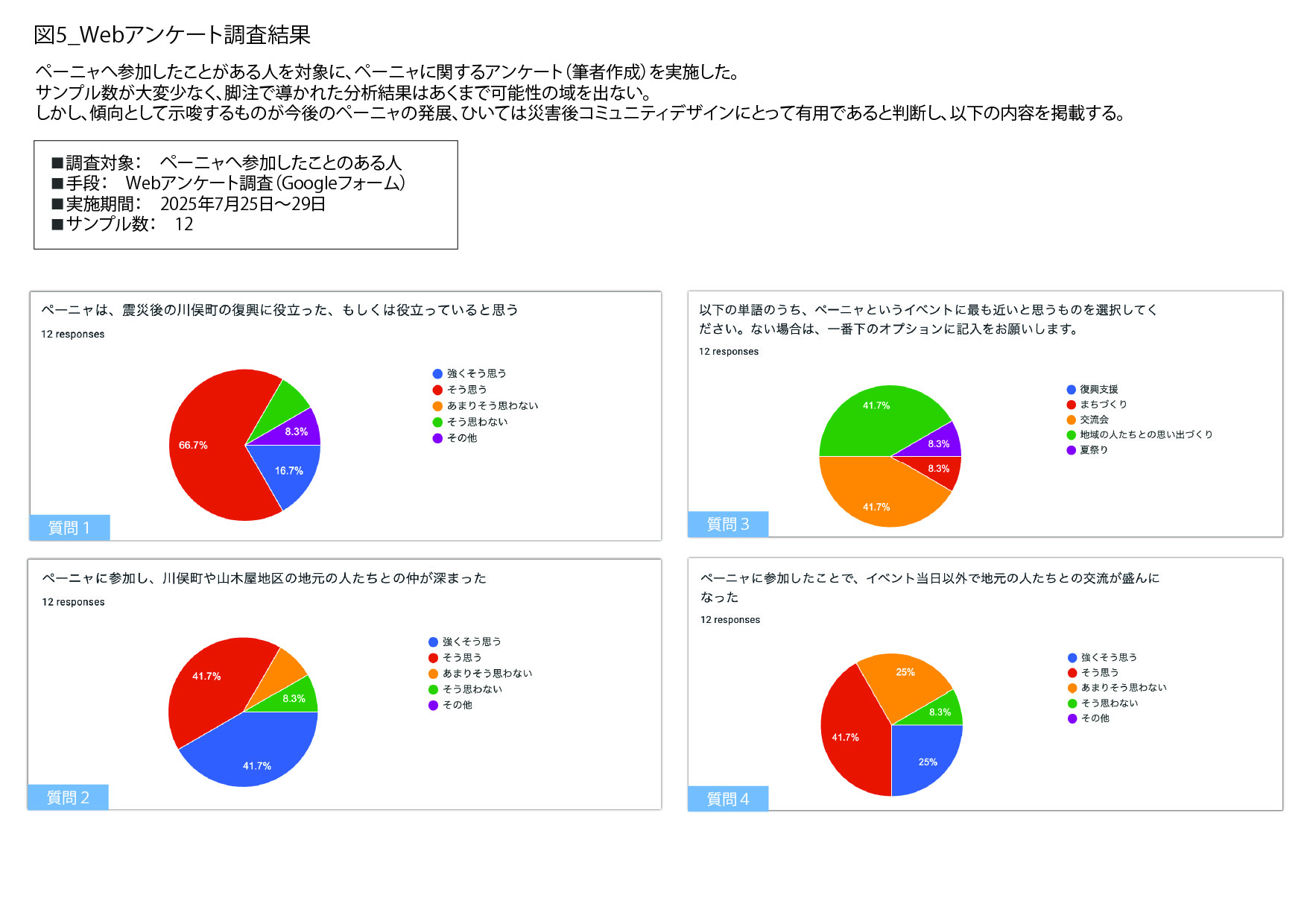 (15)ペーニャに参加したことのある人を対象としたアンケート調査では、ペーニャが震災後の川俣町の復興に役立った、ペーニャによって地元(川俣町)の人との仲が深まったと答える人はどちらも8割を超えた。(図5_Webアンケート調査結果、質問1、質問2参照。)