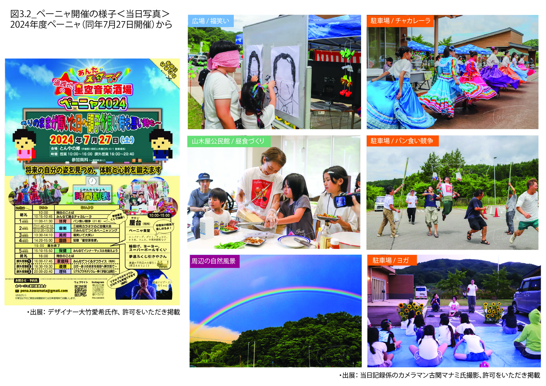 世代を超えた交流は好評を博し、以後年に一度のペースで恒例行事として継続されてきた。企画内容や町内の開催会場は固定せず、自由度の高いイベント設計を毎年一から作り上げている。近年では中心となる参加者75名前後のうち、半数弱が地元の子どもたちとなっているほか、高橋氏のネットワークを通じて首都圏のアーティストも参加するようになり、参加者層は拡大し続けている。同氏はペーニャの中で特産品などの地域資源や昭和的モチーフを配した色彩豊かなビジュアルディレクションを展開しており、地元参加者に身近な風景や地域文化への新たな視点を促すことを目指している(5、図3)。