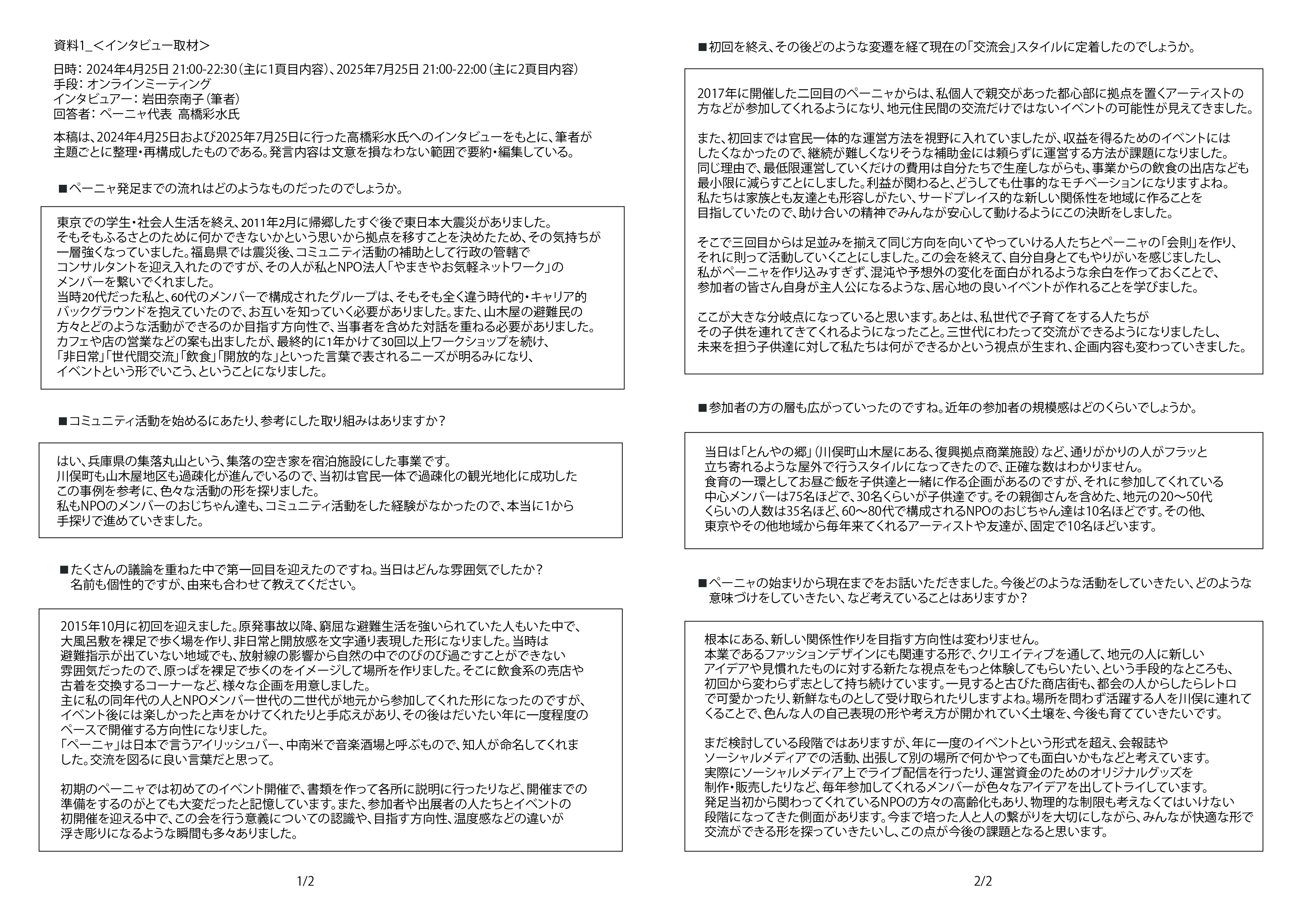 山木屋地区の避難指示解除から丸8年以上が経過し、震災の記憶も遠くなる中、ペーニャはその開催に新たな意味づけを始め、未来のより良いコミュニティ活動の形へと動き出しているのだ。