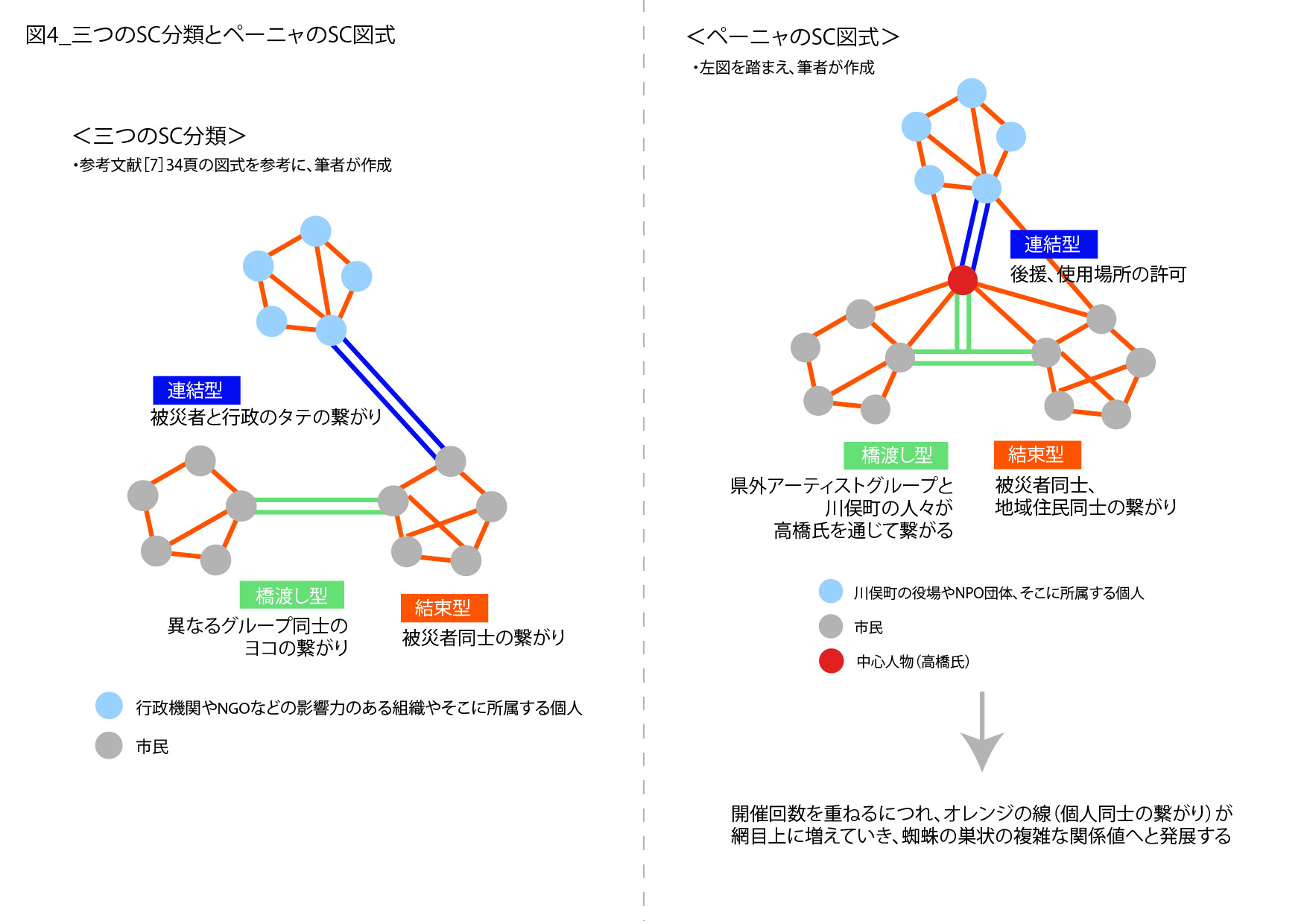 SCを分類する上で、被災者同士の繋がりを示す「結束型」、(出身地や所属など)異なるグループ同士の繋がりを示す「橋渡し型」、行政と被災者の繋がりを示す「連結型」の三つが挙げられる(12)が、ペーニャは中心人物である高橋氏を介して、全てのSC分類が機能していると分析できる(図4)。