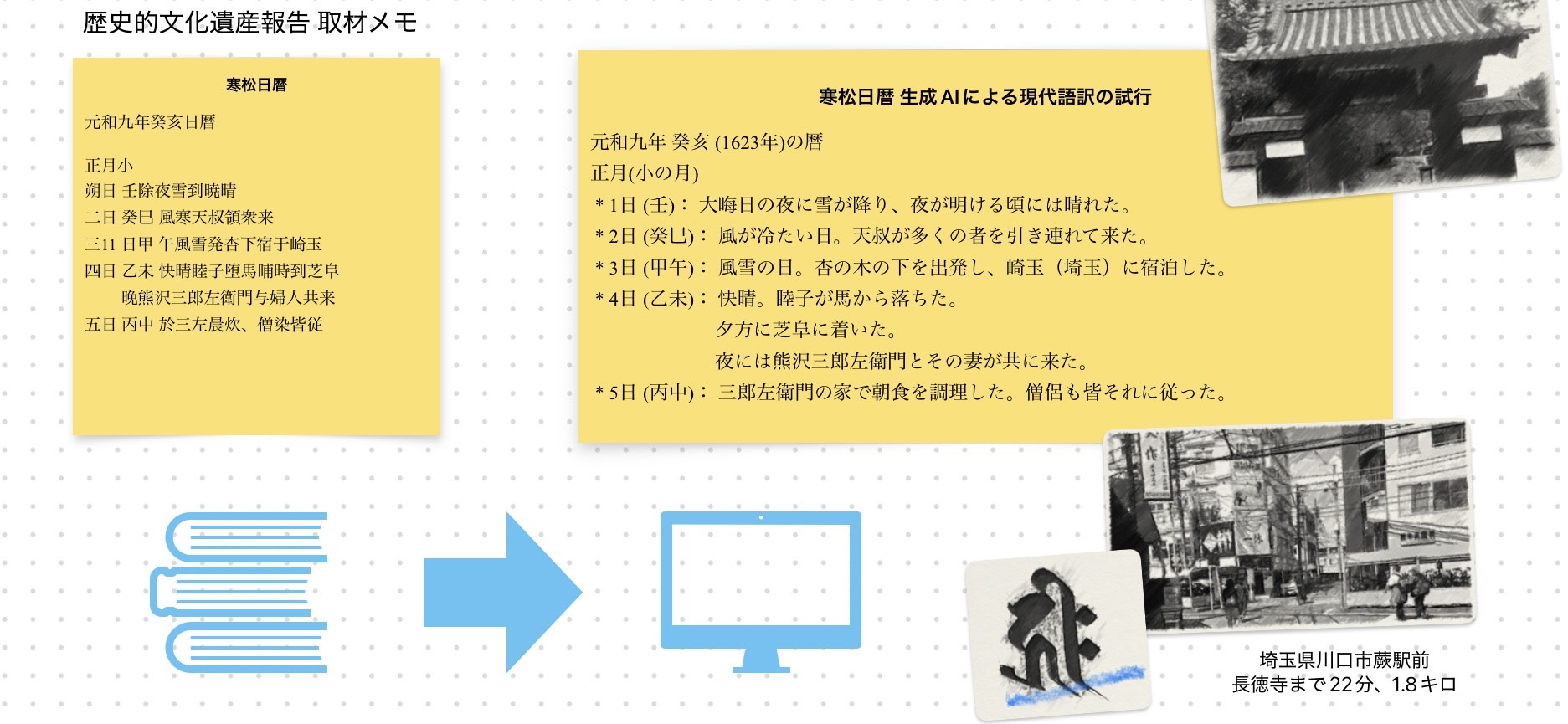 (*5)筆者の取材メモの一部。「寒松日暦」元和9年1月冒頭を生成AIで現代文に翻訳した結果を掲載。