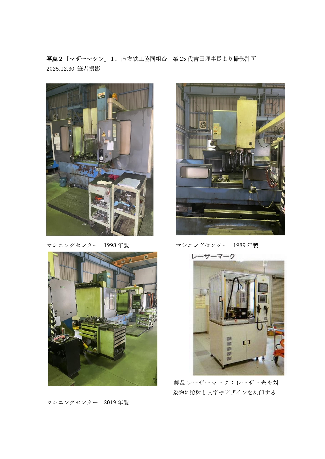 吉田氏は「令和7年創立125周年を迎えた直方鉄工組合は、産業革命を支え鉄工技術の発展に貢献した。自動車産業のみならず、医療機器・手術用補助治具や光ファイバー製造などマイクロメートルレベルの技術が取得できるまでになっている」[註9](資料9)と述べている。