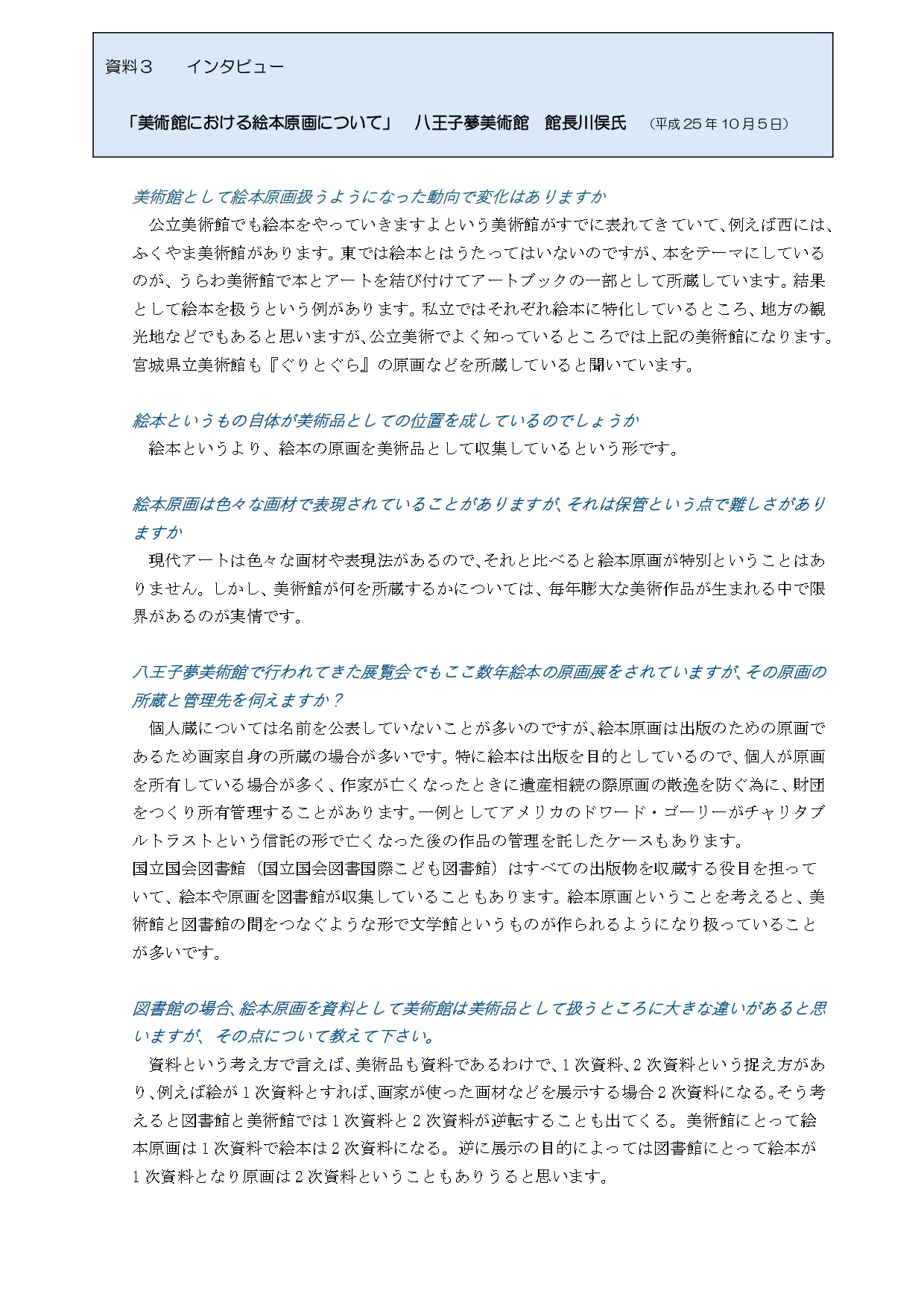 資料3 八王子夢美術館館長川俣氏インタビュー(筆者要約)