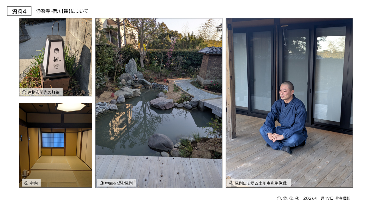 実際に、地域観光の拠点として施設を改修し、2025年9月より拝観を再開した「運慶仏」は、積極的な情報発信が奏功し、訪問客数が以前の約2倍に増加した。氏によれば「自分と向き合うようなリピーター」も現れ始めているという。次章では、同年10月より開始された宿坊(資料4)の概要を通じ、寺社が観光客に提供する体験価値と、個人の内省が共同体にもたらす循環支援の可能性について考察を深めたい。