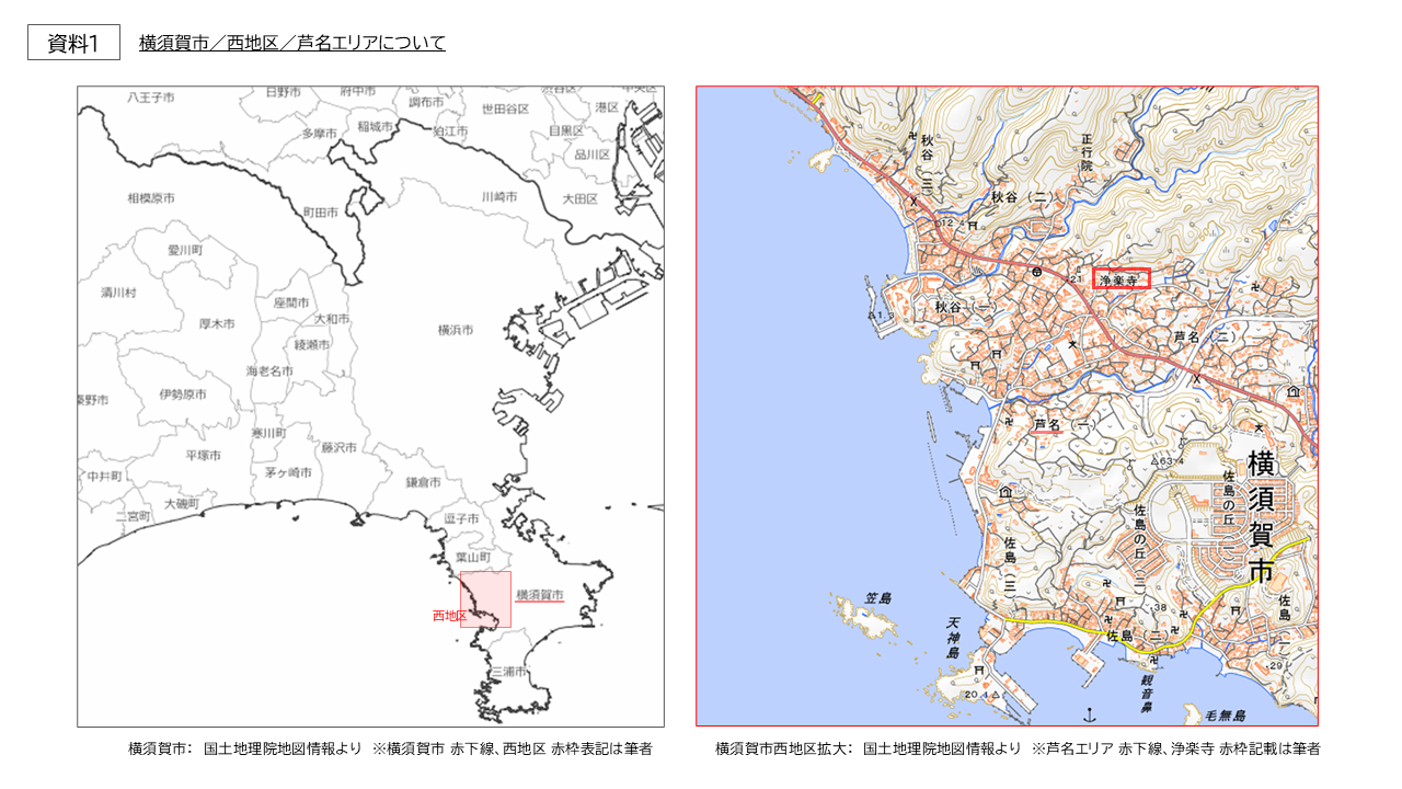 神奈川県横須賀市の西地区芦名エリア(資料1)に位置する浄楽寺(資料2)は、鎌倉時代の創建と伝えられる浄土宗寺院である。三浦半島西岸に広がる芦名エリアは、古くから農漁村としての生活文化を育みつつ、相模湾沿岸航路を通じて外部世界と接続されてきた。また鎌倉時代より、三浦氏を起源とする芦名氏の勢力圏として政治的・文化的役割を担い、近代に至るまで武家文化の継承を拠り所としながら、比較的強固な地域共同体が維持されてきた。