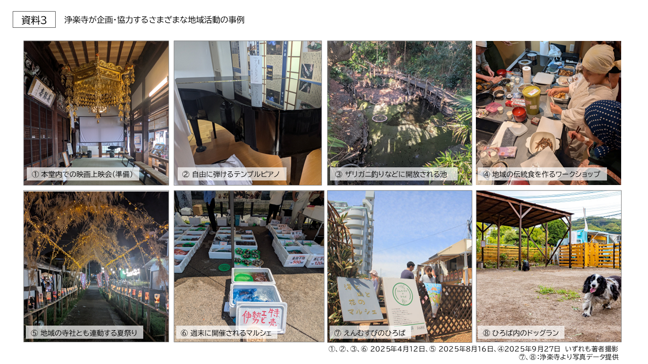 浄楽寺の副住職である土川憲弥氏は、地域および寺社が直面する諸課題に対し、地域住民を巻き込んだ多様な活動を企画・実施している(資料3)。それは、昨今多くの寺社が取り組んでいる地域食堂の開催や本堂の開放といった、直接的な社会課題解決や親睦に寄与する活動に留まらない。土川氏はイタリアの「アルベルゴ・ディフーゾ」(註6)を参考に、芦名エリアのみならず三浦半島全体への波及効果を視野に入れた観光・経済振興、そして住民による地域文化の継承を中長期的な視座から構想している(註7)。