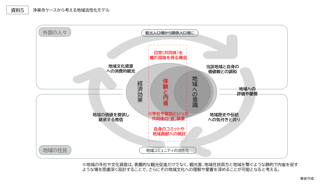 運慶仏の拝観再開と並行して宿泊施設を開業し、周辺組織との連携を深めた意図は、寺社が本来持つ「内省の場」としての機能を現代的に再提示する点にある。外部からの高い評価が地域住民の誇りとなり、それが文化継承の原動力となるという設計主旨(資料5)が読み取れる。 国内では寺院を開放したイベントやカフェの事例が増加しているが、その多くは交流や賑わいの創出に主眼が置かれている。対して浄楽寺の特筆性は、「外への価値伝播」と「地域に根差した価値」を循環させている点、すなわち強固な文化資本を背景としつつ、交流と内省(孤独)の両面を許容する中間領域を地域に開いている点にある。文化財を単なる「展示物」に留めず、来訪者の内面的な価値変容へと繋げ、最終的に地域住民の関係性を編み直す媒介としている点は、コミュニティデザインの実践として極めて高度であると評価できる。