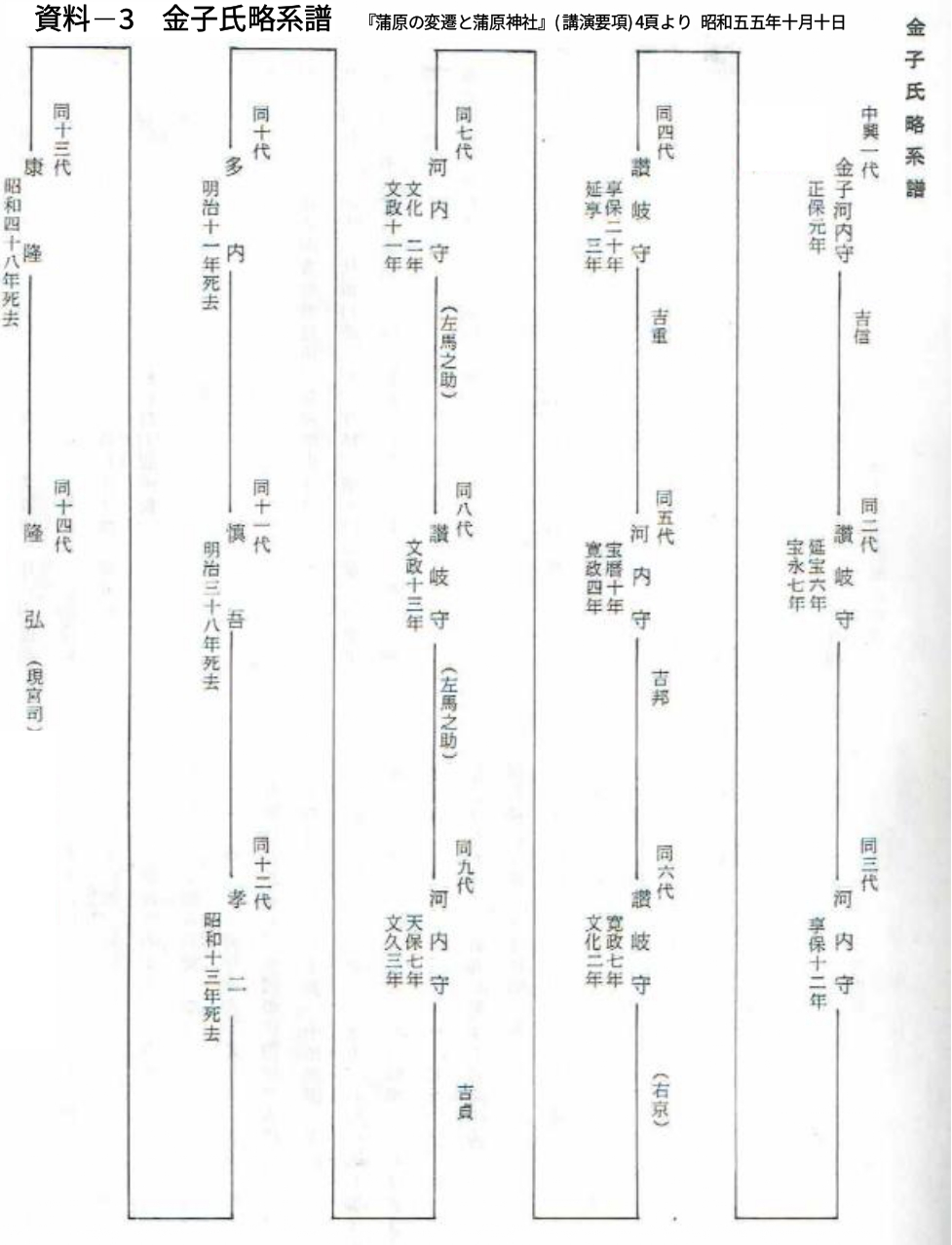 「蒲原神社」の宮司を務める金子氏の系譜は、参考文献4)-4から正保元年(一六四四)の「金子河内守吉信」を中興の祖として江戸時代までは代々「河内守」と「讃岐守」を交互に継承し、現在「金子隆弘」氏(九五歳)で十四代目を数える。戦後の代に入ってからは、神社宮司の傍ら医師となり医院を経営する兼業となった。