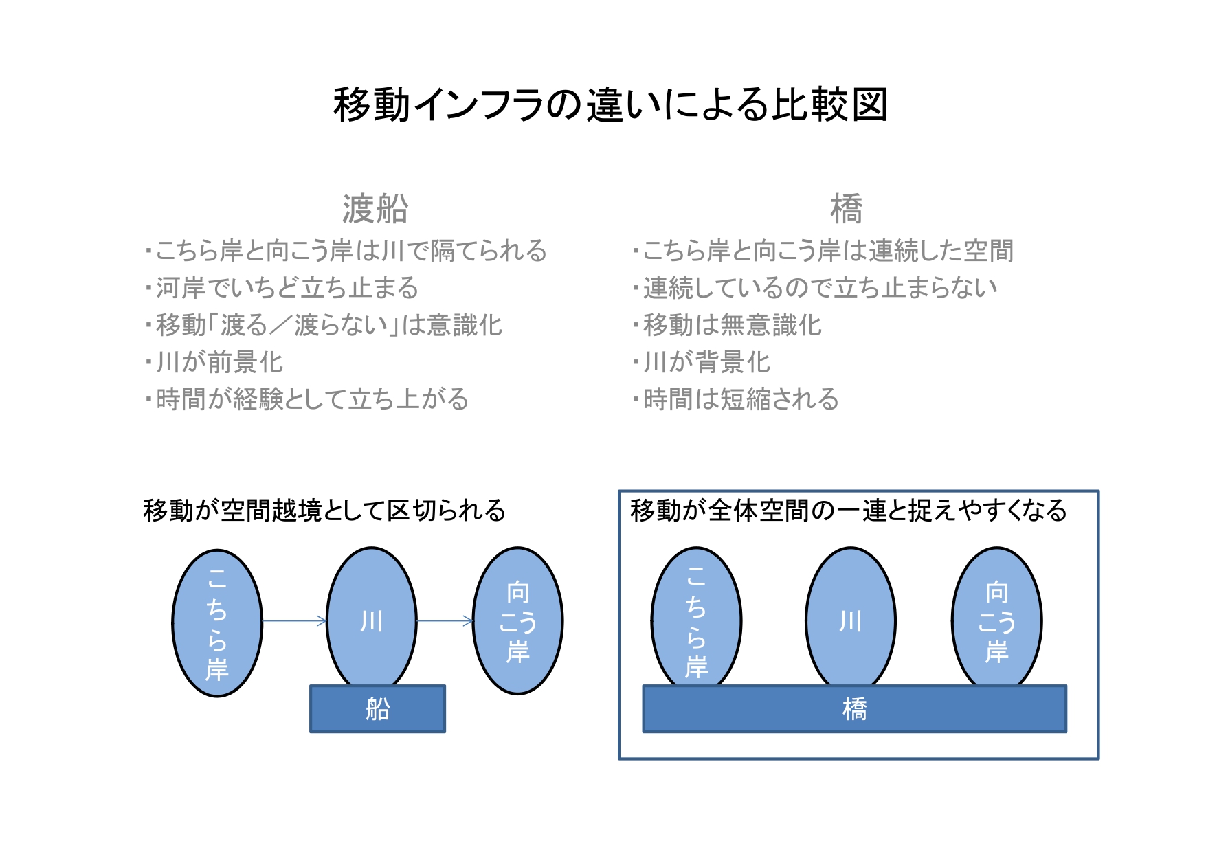 空間デザインの視点から、現況がどういった構造なのかを考察し、移動インフラの違いによる比較図[註4]をまとめた。まず、橋が架かると、こちら岸と向こう岸は同じ歩行空間の延長として接続され、川を越えるという意識は薄れるであろう。そうすると我々の日常の移動において「越境」することは徐々に無意識になり、通過は風景に溶け込む。一方で渡船という方法では、利用者は船着場でいったん立ち止まり、「渡る/渡らない」を自分で選ぶ。船に乗るという手続きが挿入されることで、移動の時間は短縮ではなく「経験」として立ち上がり、川面・流れ・対岸の距離をあらためて意識する。矢切の渡しの価値とは、そういった体験を呼び起こすことにあるといえるのではないだろうか。