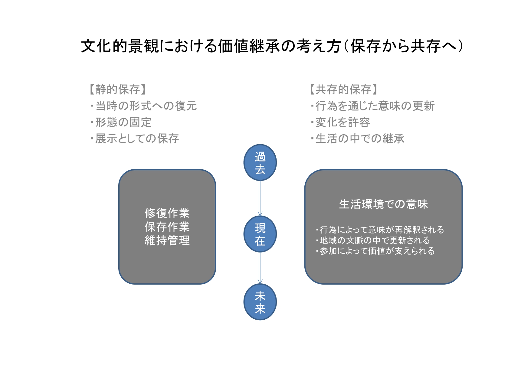 このようなことをふまえ、文化的景観における価値継承の考え方[註6]をまとめた。我々が地域生活とどのように共存できるかを生活者の視点でデザインすること。現代の我々の体験としてどのようにデザインするかが大切である。