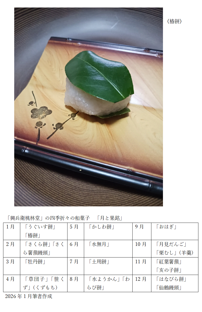 • 81191_011_32281029_1_3_M-14 図3・興兵衛桃林堂の「椿餅」と四季折々につくられる和菓子の一覧表。表は筆者作成。写真は2026年1月15日筆者撮影。
