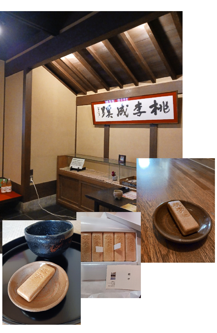與兵衞桃林堂を代表する菓子に桃李最中がある。菓銘の由来は中国の歴史家司馬遷(前145-86年頃)の『史記』(前91年頃)にある「桃李不言下自成蹊」をイメージしたものだ。桃や李の木は言葉は発せずとも美しい花や実をつけ、その下には人々が集まり自然と道が出来るという諺で、菓銘が店の理念をも表して扁額にも使われている(14)。[図4]