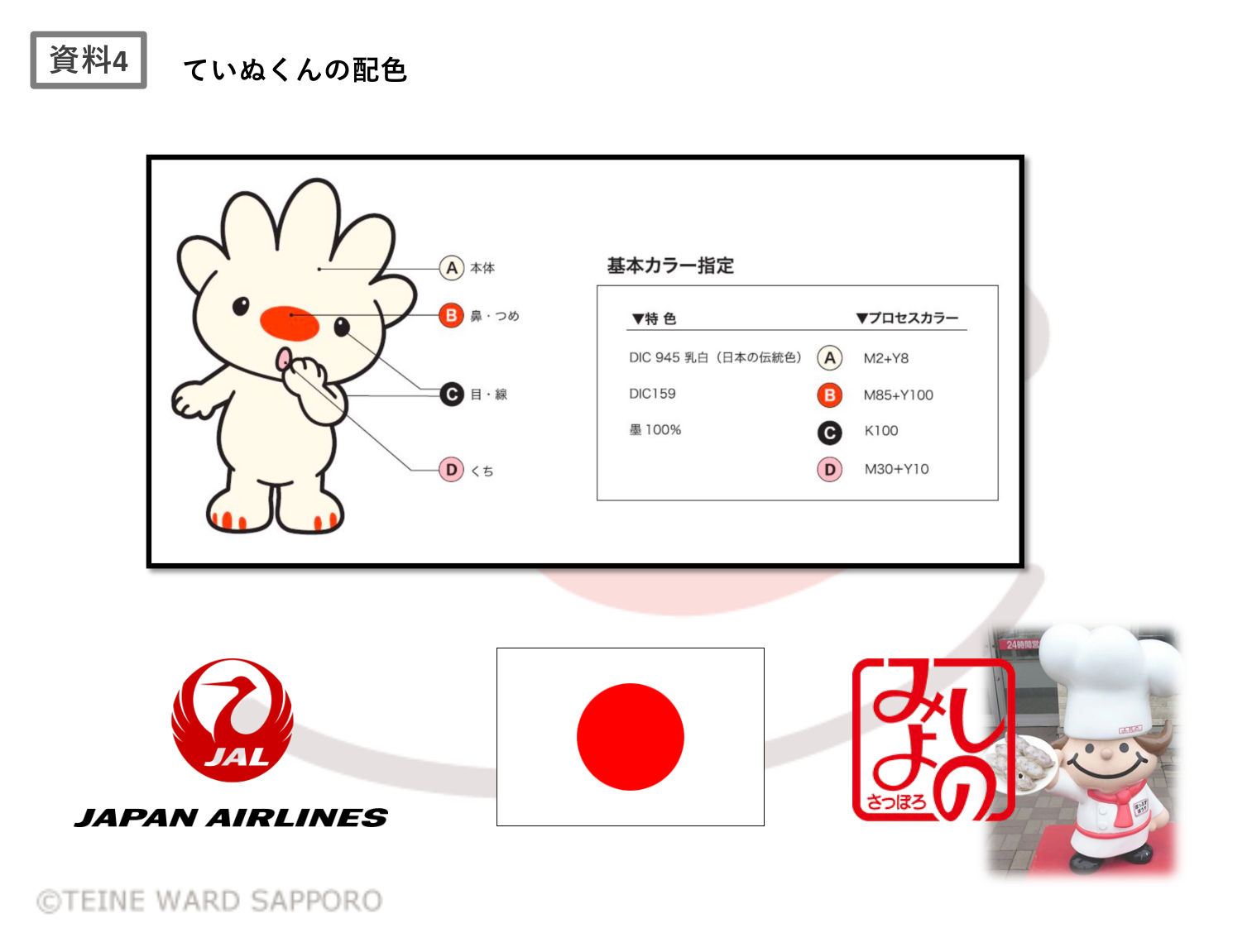 白と赤を基調としたシンプルな構成が採用されている[註7]。コントラストが明確で視認性が高く、公共空間において埋没しにくい。この配色は、日本の国旗やJALのロゴ、さらには札幌市民に親しまれてきた老舗飲食店「みよしの」のロゴやキャラクターとも共通する(資料4)。本研究では、配色の意図的参照を断定するのではなく、日本社会で共有されてきた視覚文化の受容に着目する。この色彩的共通性は、特定の対象を直接的に想起させるというよりも、蓄積された視覚記憶と無意識のレベルで接続する働きを持つ。その結果、ていぬくんは説明を介さずとも見慣れた存在として受け入れられやすくなっていると考える。この点は、公共コミュニケーションデザインとして高く評価できる要素である。