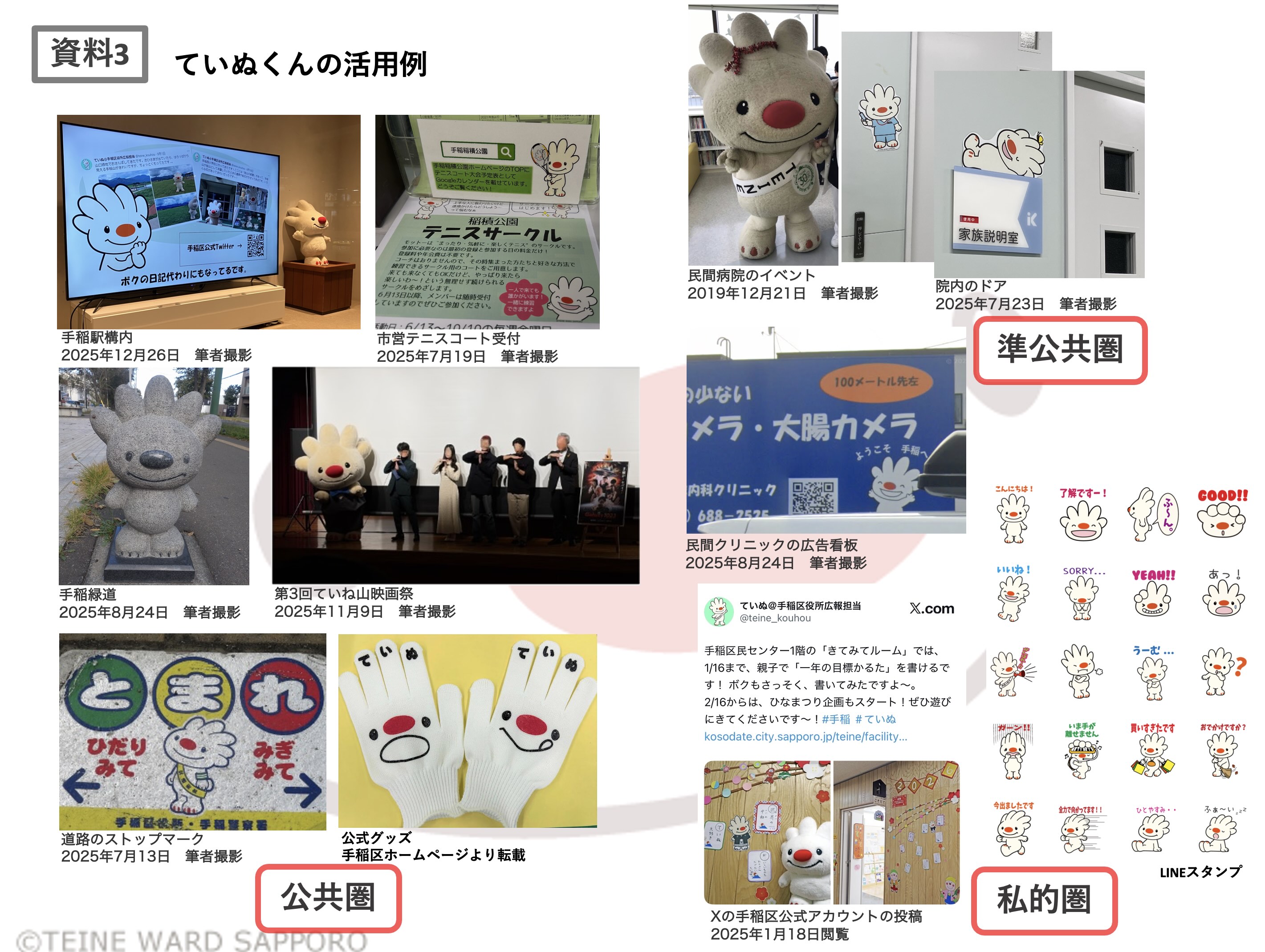 地域の触媒とは、活動や交流が生まれる際に媒介として静かに関与する存在であり、ていぬくんは日常の場に自然に配置されることで地域内のつながりを形成してきた。今後も公的・私的を問わず利用されることで、地域の日常に根ざした文化活動をつなぐ象徴として機能していくと考える。特に無償利用制度は、住民や地域団体による自発的な活用を促し、世代を問わない反復接触の基盤となる。また、近年は、Xの手稲区公式アカウントにおいて、ていぬくんを利用した写真投稿を行うなど(資料3)、SNSにおける積極的な発信は拡大傾向であり、現実空間での接触を補完している。
