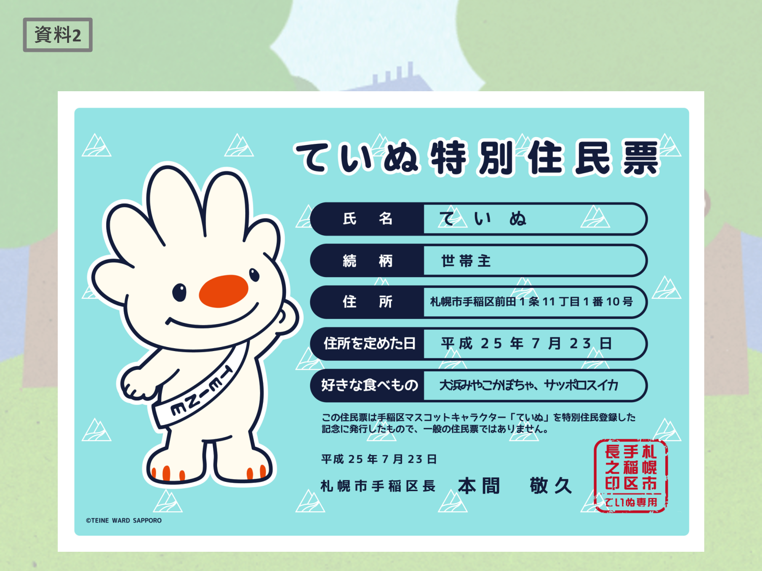 資料2 ていぬくん特別住民票(札幌市手稲区役所ホームページより) -