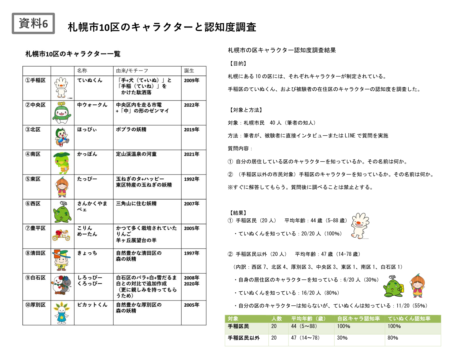 筆者が実施した認知度調査(n=40、手稲区民20名、区外市民20名)では、手稲区民におけるていぬくんの認知度は100%で、他区と比較しても群を抜いて高い結果であった(資料6)。さらに、ていぬくんは他区の市民にも比較的認知されていることが確認された。ていぬくんのシンプルな配色と曲線主体の輪郭は、視認性が高く、親しみやすさを喚起しやすい構成であり、色数が多く複雑なデザインを持つキャラクターと比較した際の優位性といえる。