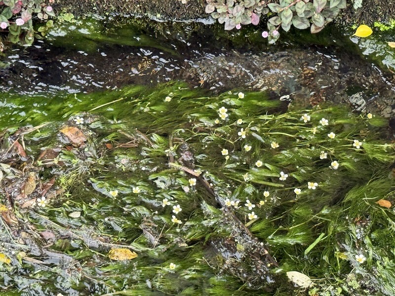• 554246_4 梅花藻は、梅の花のような白い花を水中に咲かせる日本固有種で、西日本では上流域や湧き水のある地域など、清流に限って分布する。生育適温は約15℃で、針江集落を流れる水は年間を通じて約13℃と安定しているため、そこで育つ梅花藻は一年中開花している様子が見られる。