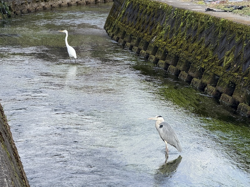 • 554246_5 針江大川でシロサギやアオサギが静かに立つ姿を見ると、水が澄み流れが安定し餌となる生き物もいる、よく保たれた水辺だと感じると同時に、動かずに佇む姿が周囲の静けさを際立たせて時間がゆっくり流れるように思える一方、飛び立つこともあるため人と野生の距離感や環境の脆さも意識させられる。