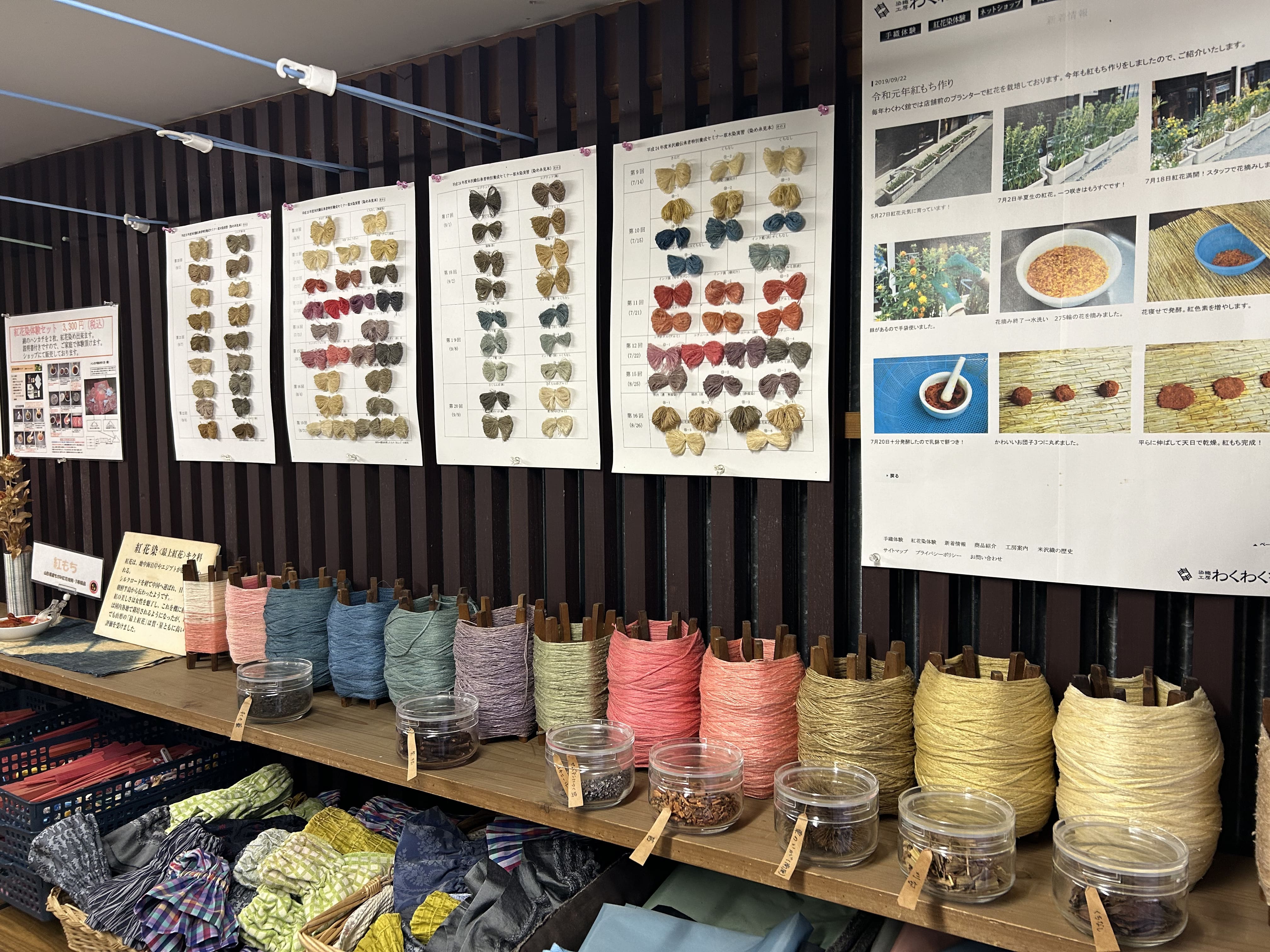 [資料5]染織工房には紅花や栗などを使った草木染の糸が並ぶ