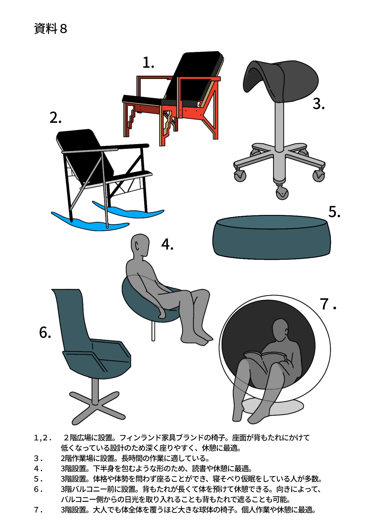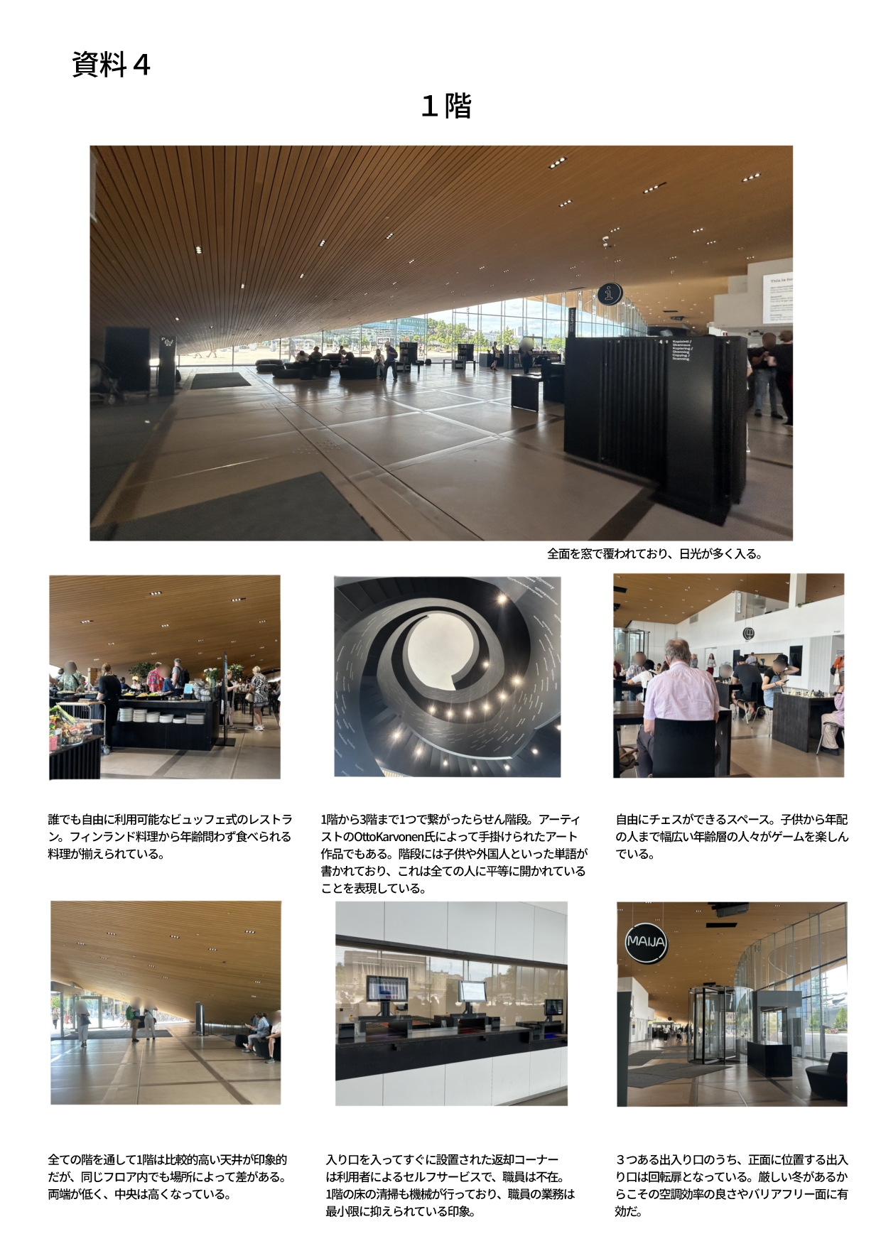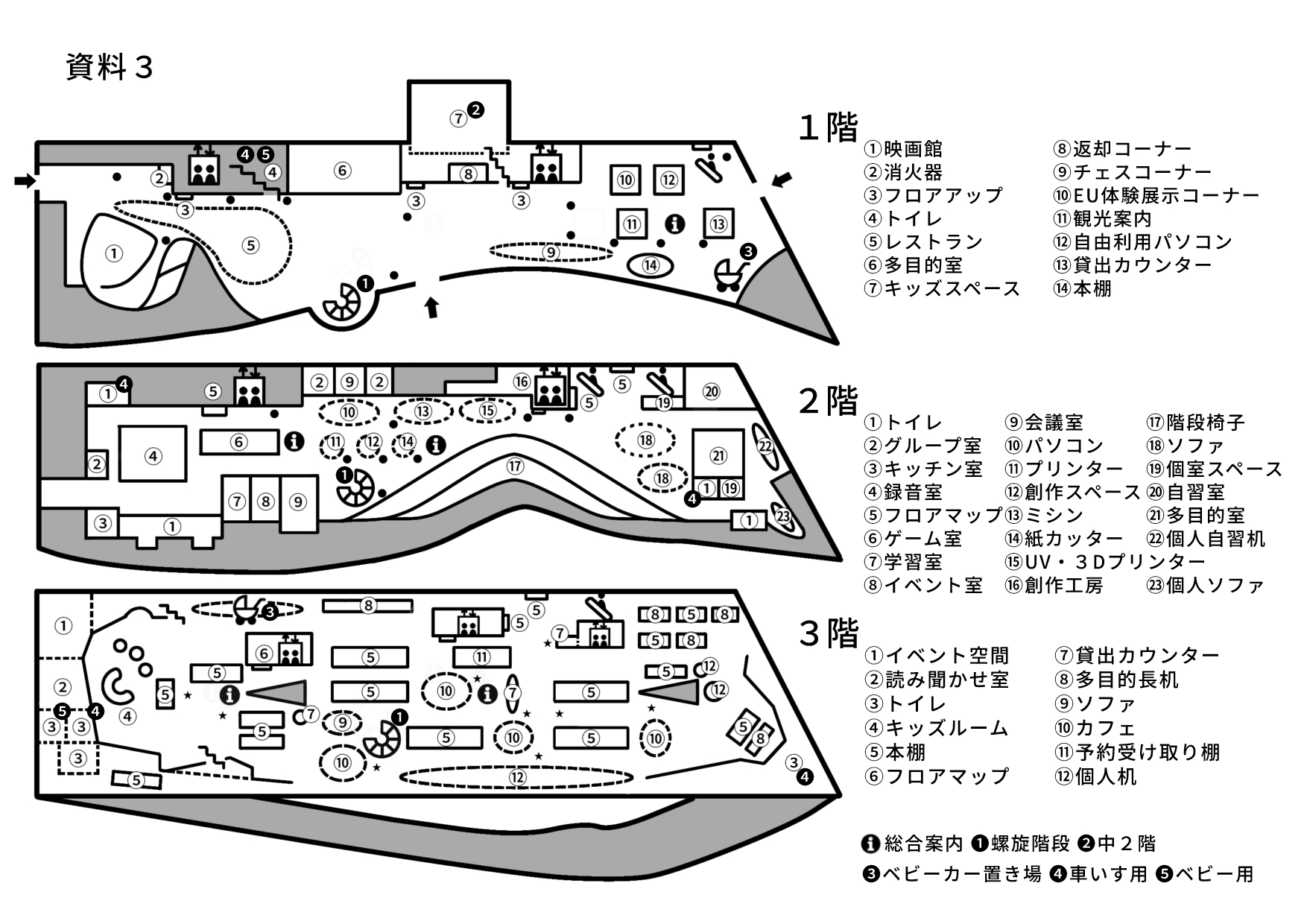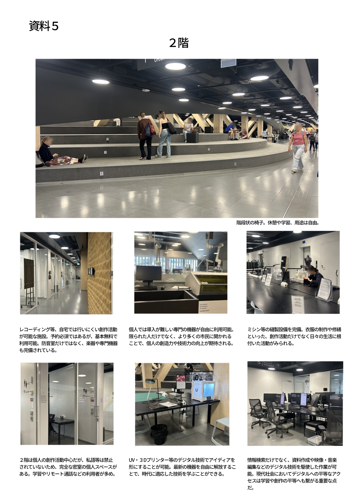全ての市民が平等であるという考えは、フィンランド社会で古くから広範に共有された価値観の1つだ。特に学びと創造へのアクセスは平等に開かれるべきだとされている。[1]したがって、2階では多様な創作活動の場となっている。UVプリンターやミシン、大型カッターなど、個人での導入が厳しい専門的な機器が取り揃えられている。ビデオゲームやレコーディング室なども完備され、これらは誰でも自由に利用することが可能だ。[資料3・5]個人の環境に関わらず、最新機器に触れアイディアを形にする体験は大きな学びとなるだろう。創作スペース以外も基本的に厳密なルールは設けず、自由に開かれている点が特徴だ。一方、こうした公共空間を誰もが平等に利用しやすくするためにはバリアフリーの観点とユニバーサルデザインは欠かせない。そこで、2・3階に設置された多くの椅子は利用する人の年齢や気分、用途に合わせた異なる設計が施されている。[資料8]2階の創作スペースはゴミが発生しやすいため小さなゴミ箱が約20個設置されており、誰もが過ごしやすい環境づくりがされている。また、全ての階に点字付きのフロアマップとインフォメーションが設置され、注意事項や案内サインにはピクトグラムが用いられている。子供の利用者が多い1階と3階にはベビーカー置き場が完備され、エレベーターはベビーカーや車いすでも余裕をもって乗れるように広々とした作りとなっている。行先階ボタンは誰でも届きやすいように低く設置され、手すりも備え付けられている。[資料3・7]また、本施設のトイレは全てがジェンダーニュートラル仕様となっており、近年の社会問題にも積極的に取り組んでいることが見て取れる。