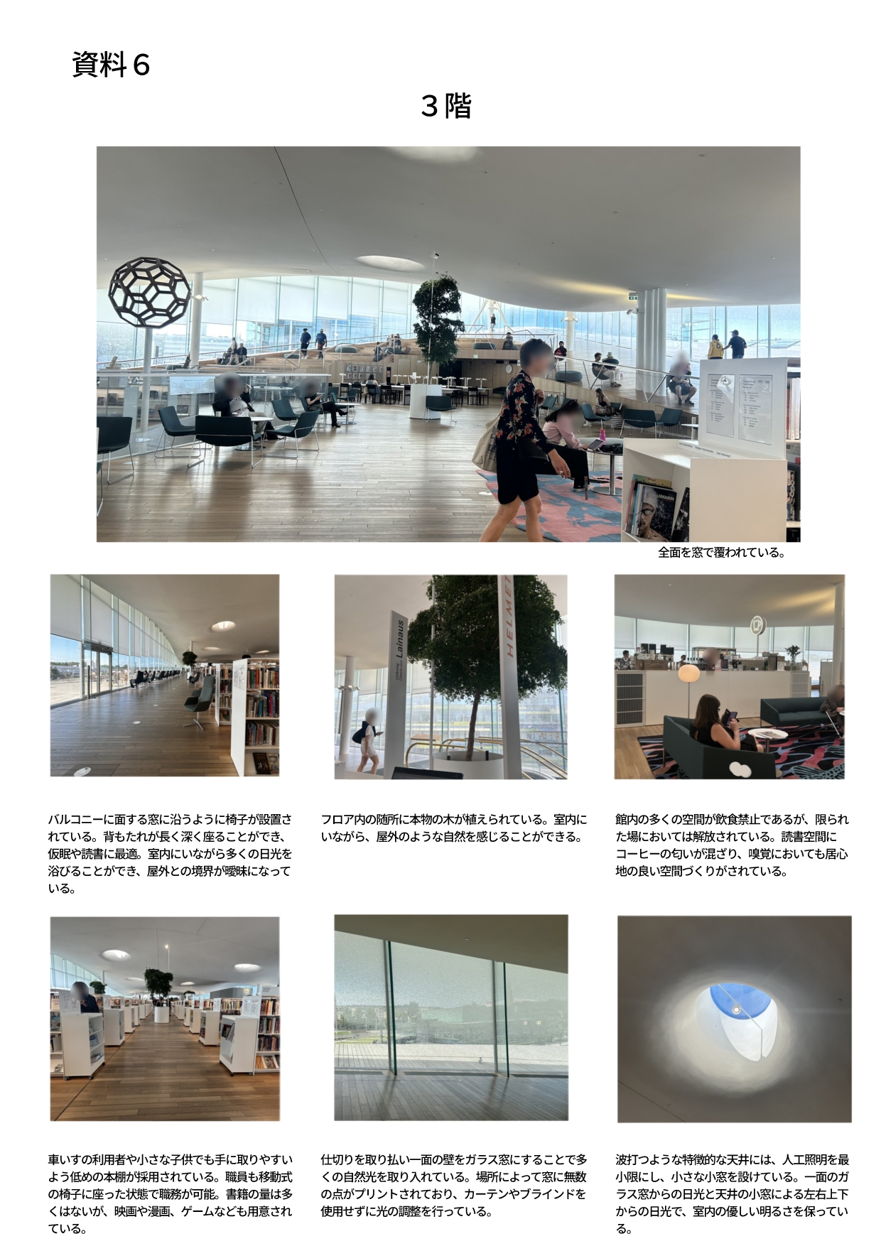 フィンランドは「森と湖の国」と呼ばれる程、北欧諸国の中で森と湖が最も多い自然豊かな国だ。[5]そんな美しい景観と厳しい風土は市民にとって日常生活を形づくる重要な存在だ。したがって、自然の価値を持続可能な形で守りながら上手く生活に活用することが重視される。例えば、すべての階に分別ごみ箱が設置されている点が挙げられる。多言語に加えピクトグラムで分別表記がされており、誰でも環境配慮に取り組みやすい工夫がされているのだ。[資料7]また、設計デザインの随所に環境配慮が見られる。3階では全面がガラス窓で覆われ、多方面から自然光が入る構造になっているのだ。[資料6]このように、自然光が多く入る構造は人工照明に依存しないエネルギーの効率化を目指せる可能性があるとされている。[6]加えて、自然光は目に優しく読書に最適で、より温かみのある空間づくりにも繋がっている。さらに、全面がガラス窓であることは外部との連続性も生み出しているだろう。風景が一望できることで室内と自然・都市の境界を曖昧にし、地続きとなって共存するのだ。外からも室内が見えることで都市との対話となり、より開けた空間デザインとなっている。また、Oodiでは地元産の木材スプルースが多く使用されている。[7]さらに、フィンランドの家具ブランドの製品も積極的に取り入れられている。地元の木材や家具ブランドを利用することも風土に根ざした観点といえるだろう。