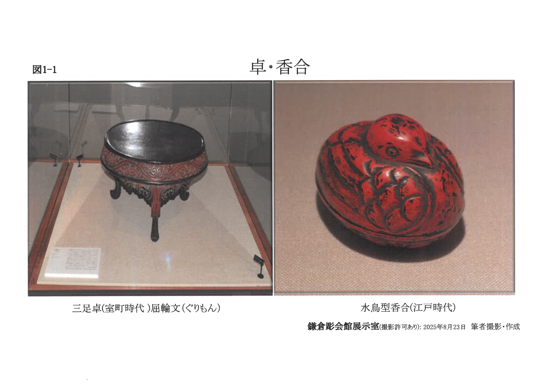 鎌倉時代における鎌倉は、武家政権の政治・文化の中心地であると同時に、禅宗を中心とする仏教文化の拠点であった(4)。そのため、大規模寺院の建立に伴い仏具や供養具の需要が増加し、鎌倉彫の制作が促進されたとされる(5)。制作技法としては、木地に文様を彫刻し、黒漆または朱漆を重ねる手法が用いられた。この技法により宗教文化に関連する造形が多数制作された(表1)。さらに、武士階層に見られた質素・簡潔を重視する生活態度や禅宗的価値観は、鎌倉彫の造形表現に一定の影響を及ぼしたとみることができる。