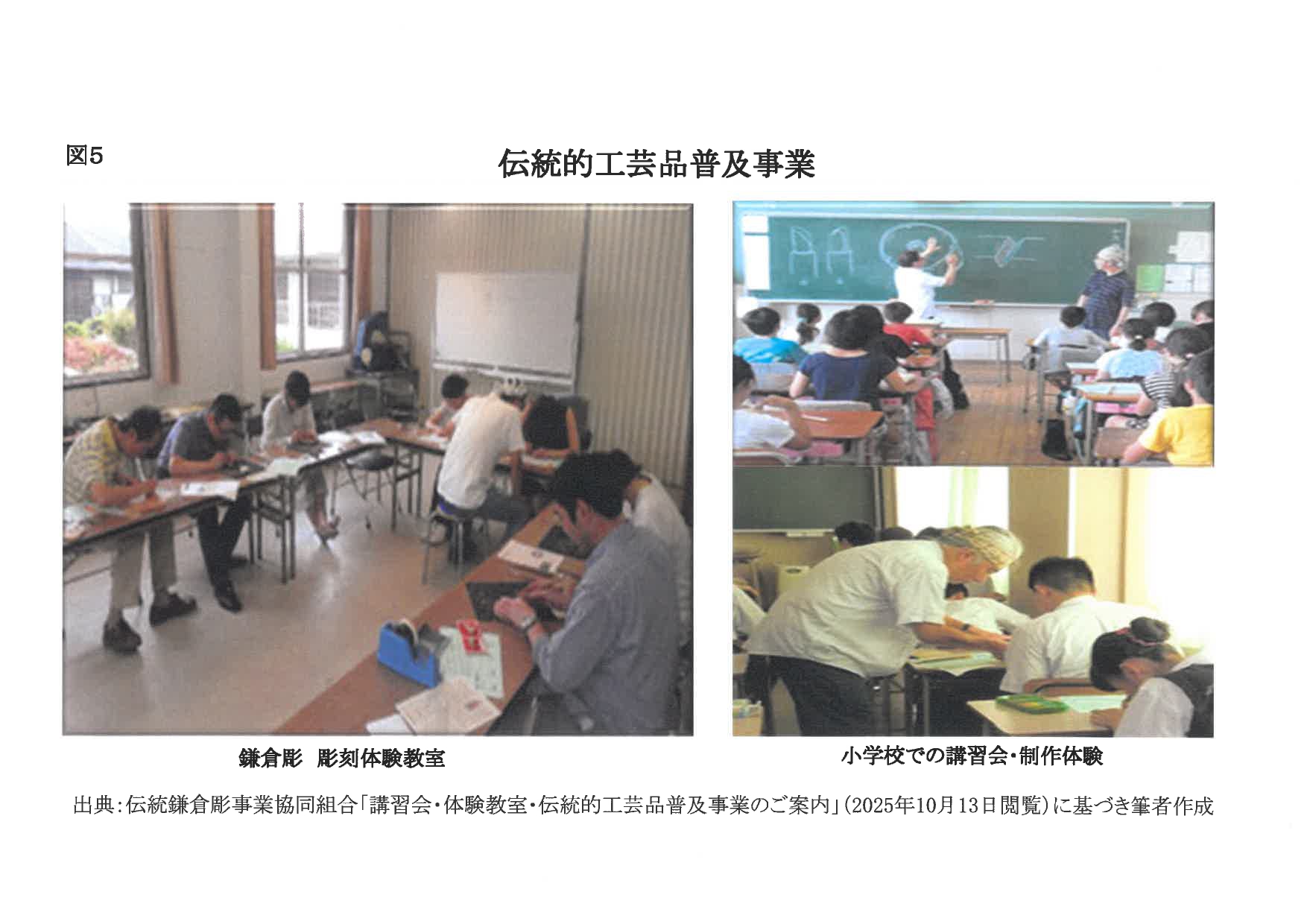 現在、組合には41の工房が加盟し、鎌倉彫工芸館を拠点に展示や普及活動を行っている。鎌倉市教育委員会や商工課と連携し、市内小学校の社会科単元「伝統工芸を学ぶ」に位置づけられた体験授業(図5)を継続的に実施しており、市の補助金に支えられ、ほとんどの小学校を巡回している。さらに旅行会社や海外団体との連携による体験プログラムも展開され、近年ではマカオの工芸関係者の来訪などインバウンド需要の広がりも確認されている。
