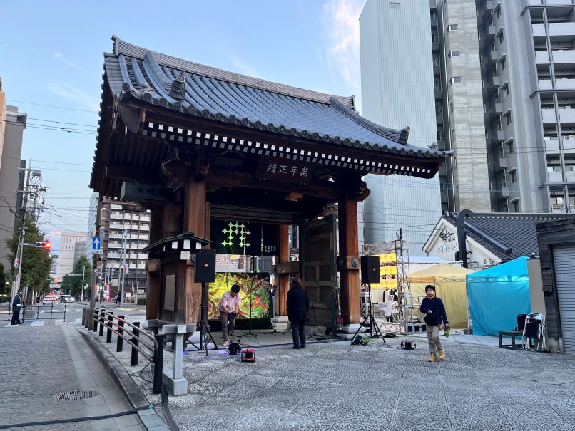旧市街はオフィスビル群に分断されている状態。一見してこの近くに寺社があるとはわからない。広い歩道が整備されており、ところどころに旧市街の案内はあるが、ほとんど主張が見られない。大通りから道一本入ると、寺社群が並ぶ。なんとかここに人を呼ぼうとする気持ちがライトアップウォークにつながった。2025年11月12日、筆者撮影。 -