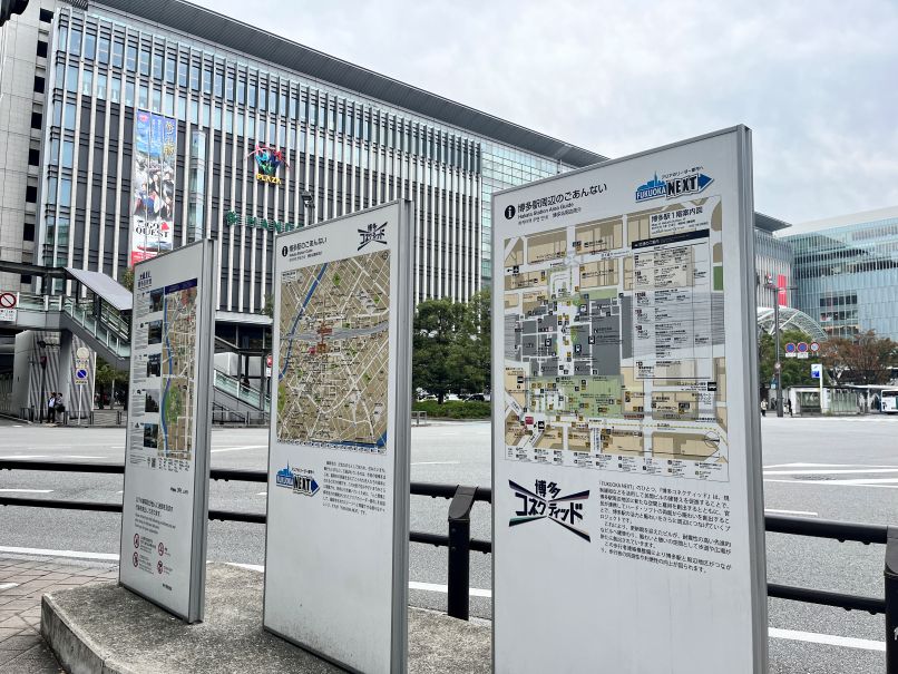 博多駅のすぐそばには旧市街へのマップがあるが、博多駅は大きな通りの向こうにある。博多駅から近いけれど、旧市街を観光目的に歩く人はほとんどいない。2025年11月12日、筆者撮影。 -