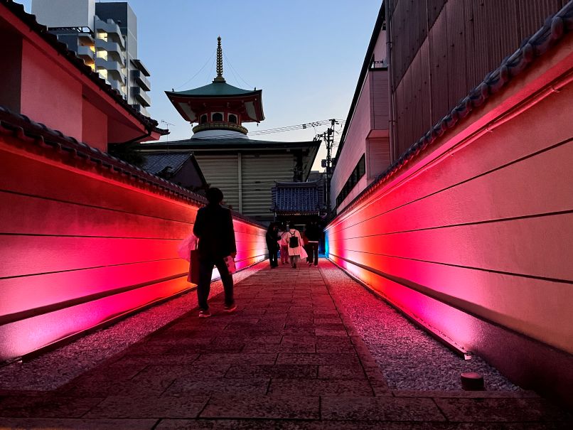 趣向を凝らしたライトアップが各寺社でおこなわれる。博多区役所の担当者はライトアップとイルミネーションは別物だと明言した。2025年11月1日、筆者撮影。 -