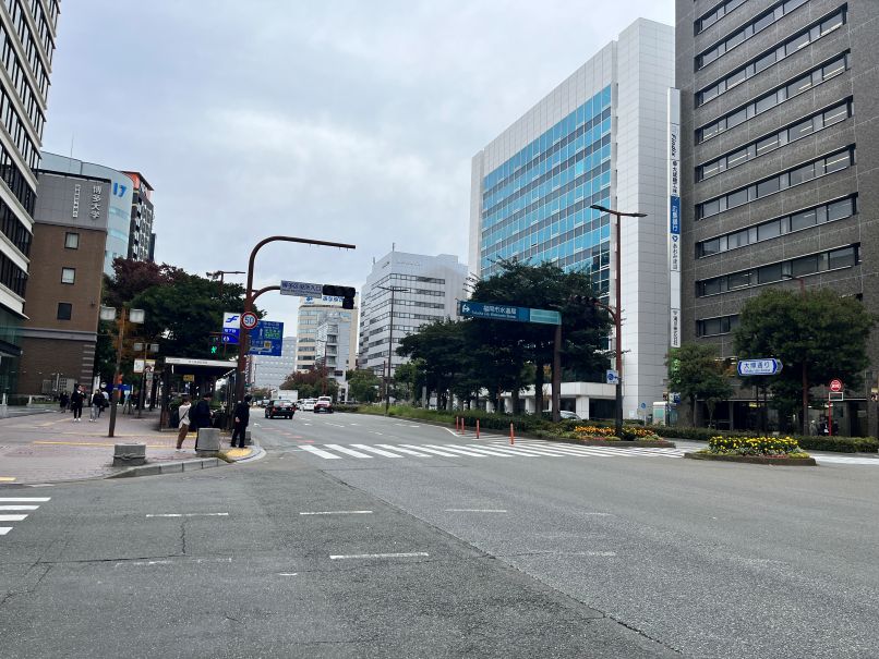 博多駅から博多千年門へ行くには、写真奥茶色のホテルを左折して直進する。右の建物壁に少し旧市街を思わせる絵などがあるが強い主張は見られない。また博多千年門への道案内もほとんどない。しかし福岡市は総じて観光地、名所への案内が苦手でわかりにくいと大阪出身の母がいつも言う。京都は名所への案内がくどいほどあるとのこと。真似をするべきかも。2025年11月12日、筆者撮影。