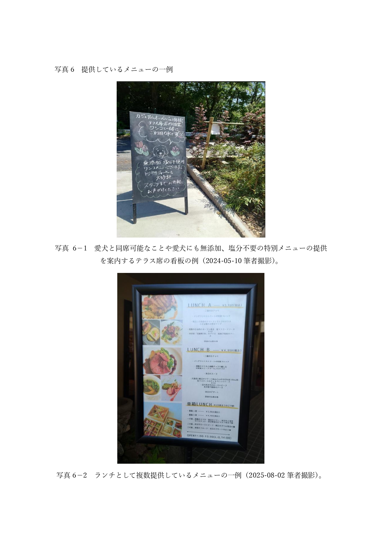 また、豊かな自然を活かしたアクティビティやイベントも積極展開しており、訪問者に多様な体験を提供している。テラス席で狭山丘陵の自然を感じながらカジュアルに食事を楽しめるため、サイクリングやハイキングを楽しむ方々も気軽に立ち寄ることができるのも評価できる。メニューは、地元の農家や生産者との連携により新鮮で高品質な食材を調達していることも大きな魅力である(写真6)。この取り組みは、地産地消の推進と持続可能な運営モデルの構築、地域経済の活性化に寄与している。例えば、所沢牛を使用した「所沢牛プレミアムカレー」や「所沢牛ローストビーフサンド」は、素材の味を活かしつつ、フレンチと和の要素を融合させた独自の一皿として評価が高い。これにより、訪問者は所沢の地域性を味覚で体験することが可能である。