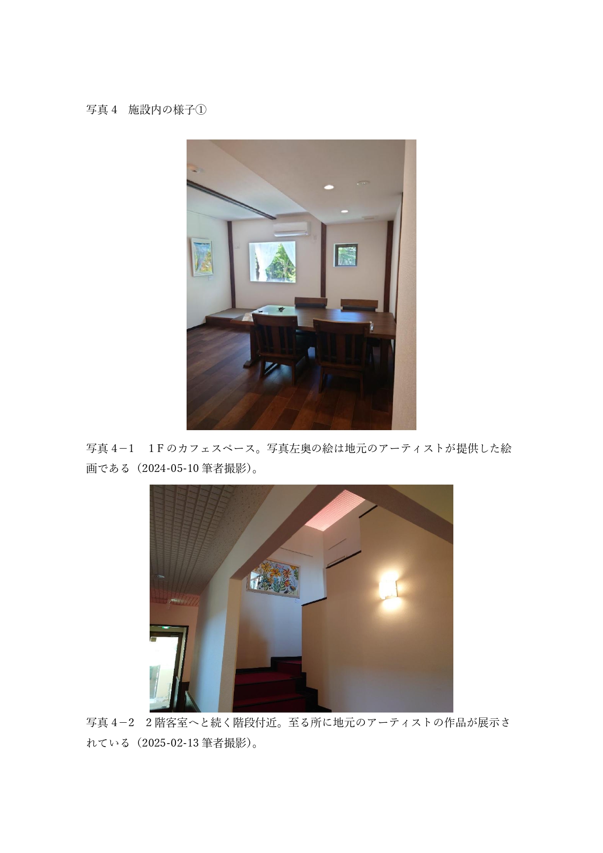 樹樹は、かつての廃ホテル(モーテル)をリノベーションし再生された(写真2・写真3)。このプロジェクトは地域活性化の一環として位置づけられており、地域の歴史と文化を尊重しながら新たな価値を創出する取り組みである。開業以降、狭山茶や所沢牛といった地元食材をメニューに積極的に取り入れていることが特徴である。樹樹の名はフランス語で出汁の意味を持つ「Jus-ジュ」から引用しているが、フランス料理に和のエッセンスを加えた独自の料理スタイルは、訪問者から高い評価を受けている。施設内のカフェスペースには地元の若手アーティストによる作品が展示され、地域の文化振興にも寄与している(写真4)。