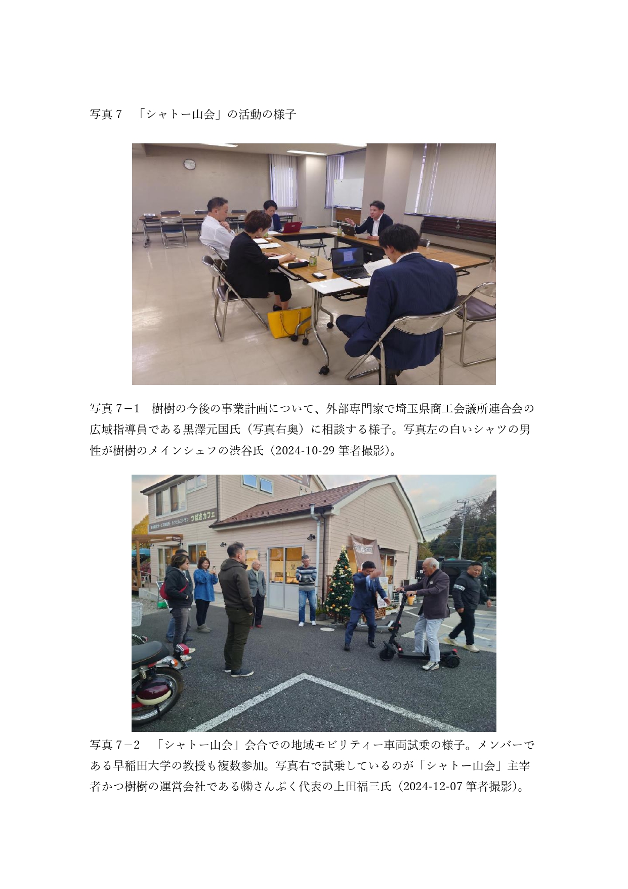 また、専門家の意見を取り入れた事業や宿泊施設としての機能強化、訪問者の多様なニーズに応えるための設備投資も計画されている。例えば、高齢化と後継者難に苦しむ三ケ島エリアの葡萄農家と連携した葡萄栽培の宿泊付体験型イベントや地元葡萄を使ったワイン造り、地域モビリティーを活用して樹樹を拠点に狭山湖畔を周遊するといった取り組みである(写真7)。これにより、国内外からの観光客をさらに誘致することが期待されている。